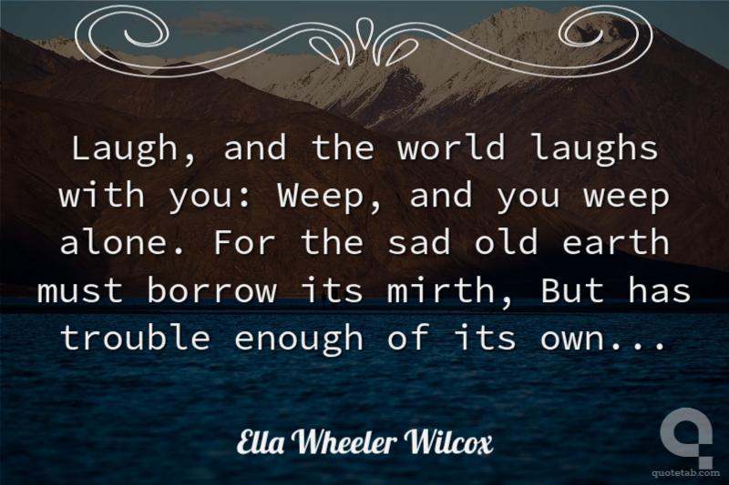 Laugh, and the world laughs with you: Weep, and you weep alone. For the sad old earth must borrow its mirth, But has trouble enough of its own...