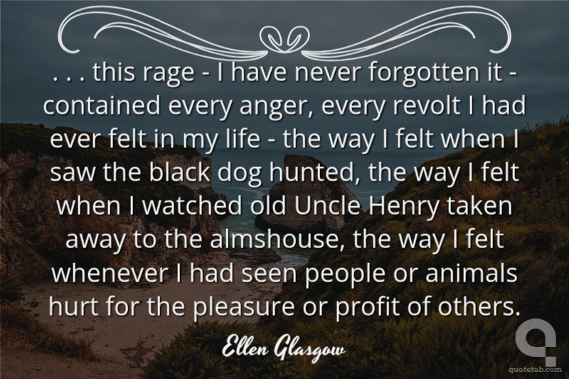 . . . this rage - I have never forgotten it - contained every anger, every revolt I had ever felt in my life - the way I felt when I saw the black dog hunted, the way I felt when I watched old Uncle Henry taken away to the almshouse, the way I felt whenever I had seen people or animals hurt for the pleasure or profit of others.