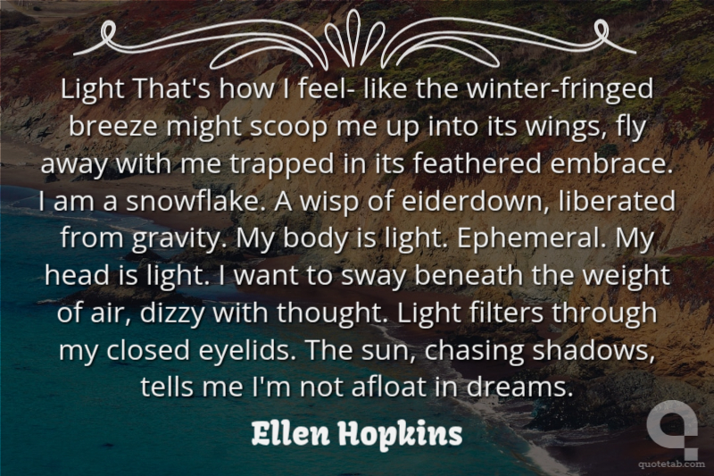Light That's how I feel- like the winter-fringed breeze might scoop me up into its wings, fly away with me trapped in its feathered embrace. I am a snowflake. A wisp of eiderdown, liberated from gravity. My body is light. Ephemeral. My head is light. I want to sway beneath the weight of air, dizzy with thought. Light filters through my closed eyelids. The sun, chasing shadows, tells me I'm not afloat in dreams.