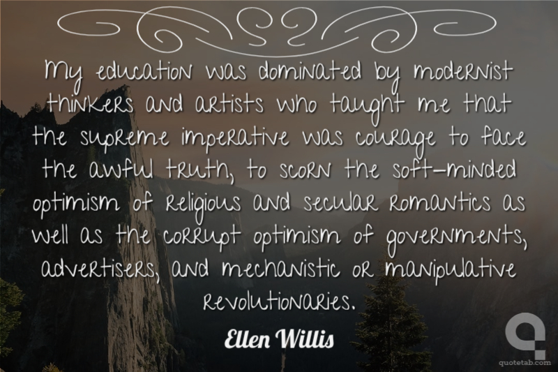 My education was dominated by modernist thinkers and artists who taught me that the supreme imperative was courage to face the awful truth, to scorn the soft-minded optimism of religious and secular romantics as well as the corrupt optimism of governments, advertisers, and mechanistic or manipulative revolutionaries.