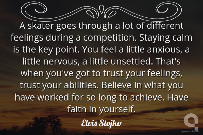 A skater goes through a lot of different feelings during a competition. Staying calm is the key point. You feel a little anxious, a little nervous, a little unsettled. That's when you've got to trust your feelings, trust your abilities. Believe in what you have worked for so long to achieve. Have faith in yourself.