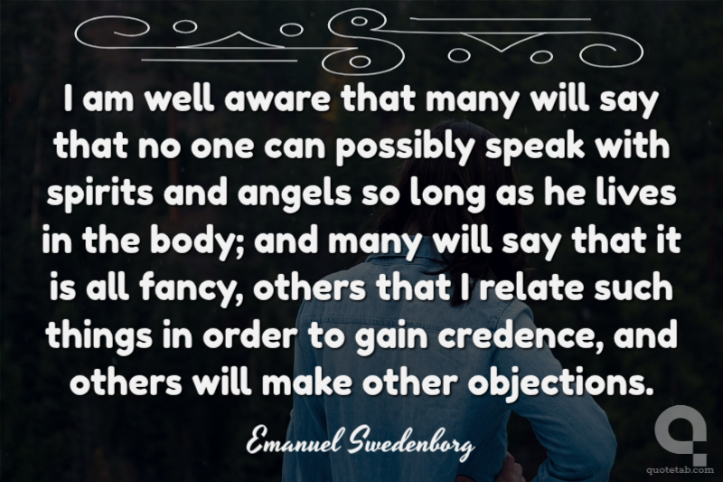 I am well aware that many will say that no one can possibly speak with spirits and angels so long as he lives in the body; and many will say that it is all fancy, others that I relate such things in order to gain credence, and others will make other objections.