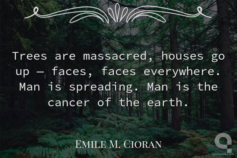 Trees are massacred, houses go up — faces, faces everywhere. Man is spreading. Man is the cancer of the earth.