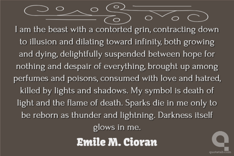 I am the beast with a contorted grin, contracting down to illusion and dilating toward infinity, both growing and dying, delightfully suspended between hope for nothing and despair of everything, brought up among perfumes and poisons, consumed with love and hatred, killed by lights and shadows. My symbol is death of light and the flame of death. Sparks die in me only to be reborn as thunder and lightning. Darkness itself glows in me.