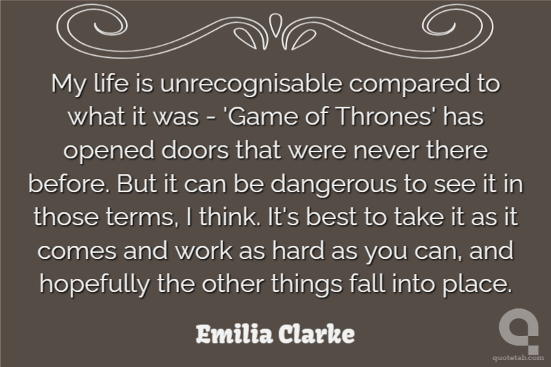 My life is unrecognisable compared to what it was - 'Game of Thrones' has opened doors that were never there before. But it can be dangerous to see it in those terms, I think. It's best to take it as it comes and work as hard as you can, and hopefully the other things fall into place.