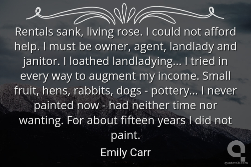 Rentals sank, living rose. I could not afford help. I must be owner, agent, landlady and janitor. I loathed landladying... I tried in every way to augment my income. Small fruit, hens, rabbits, dogs - pottery... I never painted now - had neither time nor wanting. For about fifteen years I did not paint.