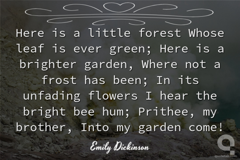 Here is a little forest Whose leaf is ever green; Here is a brighter garden, Where not a frost has been; In its unfading flowers I hear the bright bee hum; Prithee, my brother, Into my garden come!