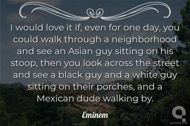 I would love it if, even for one day, you could walk through a neighborhood and see an Asian guy sitting on his stoop, then you look across the street and see a black guy and a white guy sitting on their porches, and a Mexican dude walking by.