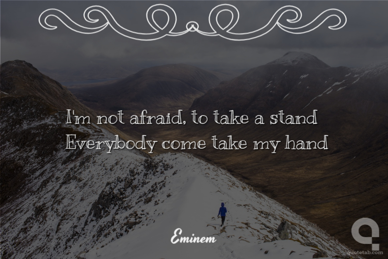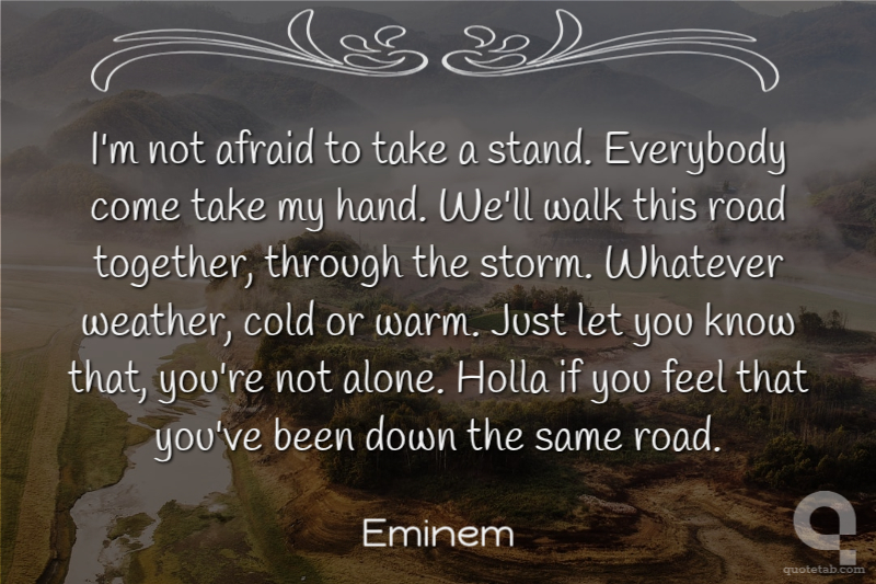 I'm not afraid to take a stand. Everybody come take my hand. We'll walk this road together, through the storm. Whatever weather, cold or warm. Just let you know that, you're not alone. Holla if you feel that you've been down the same road.