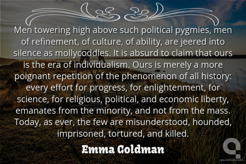 Men towering high above such political pygmies, men of refinement, of culture, of ability, are jeered into silence as mollycoddles. It is absurd to claim that ours is the era of individualism. Ours is merely a more poignant repetition of the phenomenon of all history: every effort for progress, for enlightenment, for science, for religious, political, and economic liberty, emanates from the minority, and not from the mass. Today, as ever, the few are misunderstood, hounded, imprisoned, tortured, and killed.