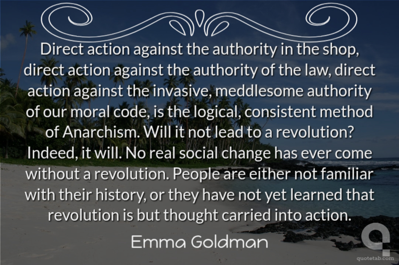 Direct action against the authority in the shop, direct action against the authority of the law, direct action against the invasive, meddlesome authority of our moral code, is the logical, consistent method of Anarchism. Will it not lead to a revolution? Indeed, it will. No real social change has ever come without a revolution. People are either not familiar with their history, or they have not yet learned that revolution is but thought carried into action.
