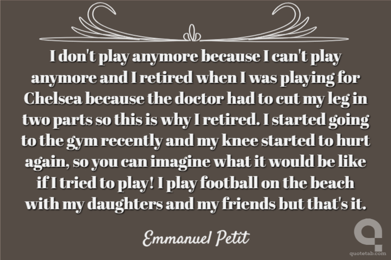 I don't play anymore because I can't play anymore and I retired when I was playing for Chelsea because the doctor had to cut my leg in two parts so this is why I retired. I started going to the gym recently and my knee started to hurt again, so you can imagine what it would be like if I tried to play! I play football on the beach with my daughters and my friends but that's it.