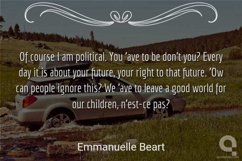 Of course I am political. You 'ave to be don't you? Every day it is about your future, your right to that future. 'Ow can people ignore this? We 'ave to leave a good world for our children, n'est-ce pas?