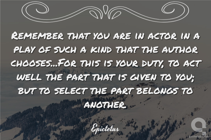 Remember that you are an actor in a drama, of such a part as it may please the master to assign you, for a long time or for a little as he may choose. And if he will you to take the part of a poor man, or a cripple, or a ruler, or a private citizen, then may you act that part with grace! For to act well the part that is allotted to us, that indeed is ours to do, but to choose it is another s.