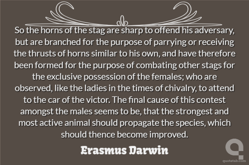 So the horns of the stag are sharp to offend his adversary, but are branched for the purpose of parrying or receiving the thrusts of horns similar to his own, and have therefore been formed for the purpose of combating other stags for the exclusive possession of the females; who are observed, like the ladies in the times of chivalry, to attend to the car of the victor. The final cause of this contest amongst the males seems to be, that the strongest and most active animal should propagate the species, which should thence become improved.