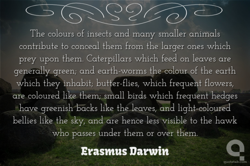 The colours of insects and many smaller animals contribute to conceal them from the larger ones which prey upon them. Caterpillars which feed on leaves are generally green; and earth-worms the colour of the earth which they inhabit; butter-flies, which frequent flowers, are coloured like them; small birds which frequent hedges have greenish backs like the leaves, and light-coloured bellies like the sky, and are hence less visible to the hawk who passes under them or over them.