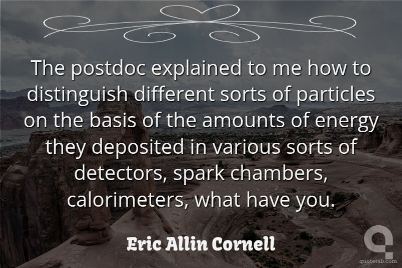 The postdoc explained to me how to distinguish different sorts of particles on the basis of the amounts of energy they deposited in various sorts of detectors, spark chambers, calorimeters, what have you.