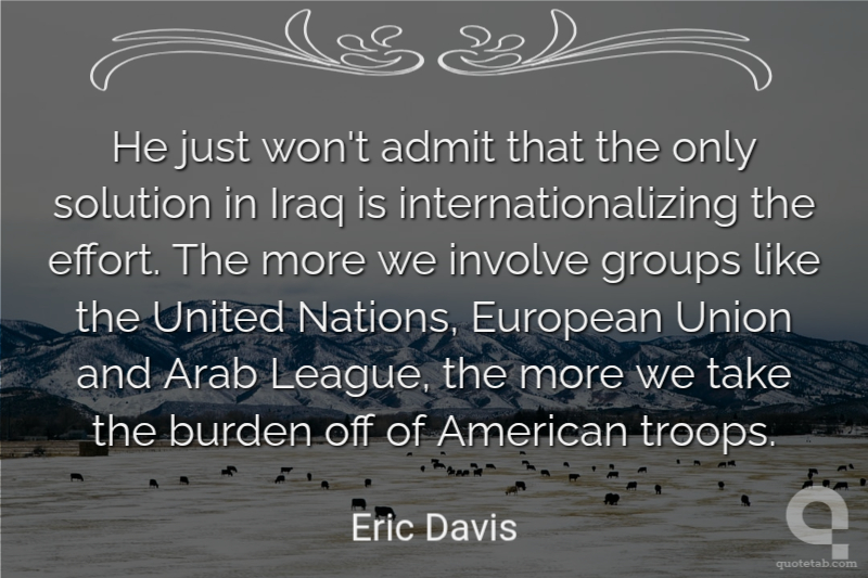 He just won't admit that the only solution in Iraq is internationalizing the effort. The more we involve groups like the United Nations, European Union and Arab League, the more we take the burden off of American troops.