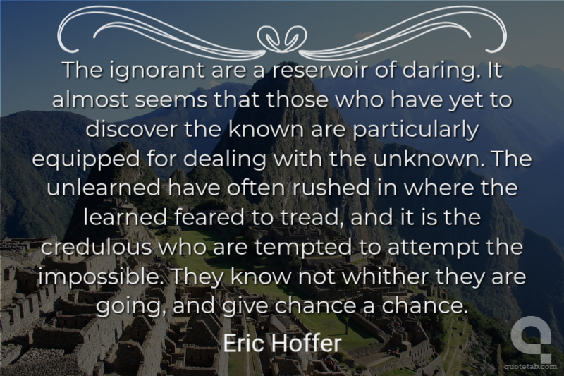 The ignorant are a reservoir of daring. It almost seems that those who have yet to discover the known are particularly equipped for dealing with the unknown. The unlearned have often rushed in where the learned feared to tread, and it is the credulous who are tempted to attempt the impossible. They know not whither they are going, and give chance a chance.