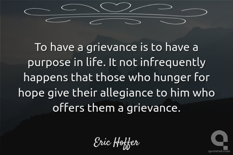 To have a grievance is to have a purpose in life. It not infrequently happens that those who hunger for hope give their allegiance to him who offers them a grievance.