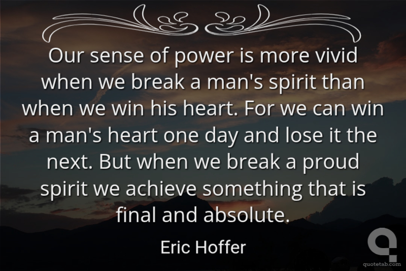 Our sense of power is more vivid when we break a man's spirit than when we win his heart. For we can win a man's heart one day and lose it the next. But when we break a proud spirit we achieve something that is final and absolute.