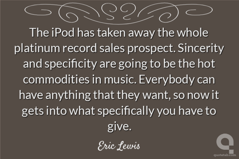 The iPod has taken away the whole platinum record sales prospect. Sincerity and specificity are going to be the hot commodities in music. Everybody can have anything that they want, so now it gets into what specifically you have to give.
