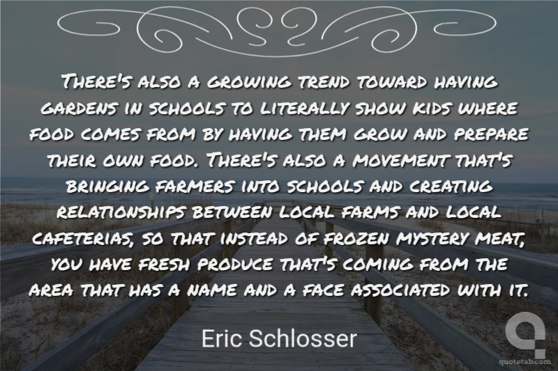 There's also a growing trend toward having gardens in schools to literally show kids where food comes from by having them grow and prepare their own food. There's also a movement that's bringing farmers into schools and creating relationships between local farms and local cafeterias, so that instead of frozen mystery meat, you have fresh produce that's coming from the area that has a name and a face associated with it.