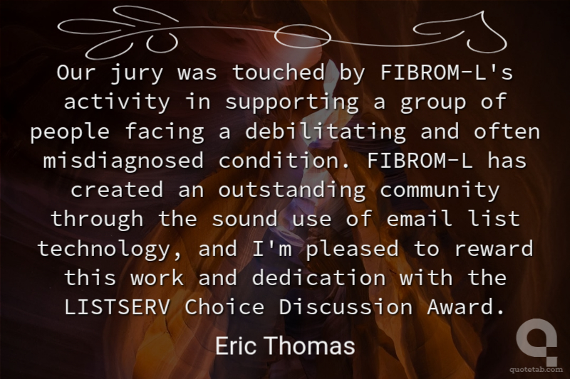 Our jury was touched by FIBROM-L's activity in supporting a group of people facing a debilitating and often misdiagnosed condition. FIBROM-L has created an outstanding community through the sound use of email list technology, and I'm pleased to reward this work and dedication with the LISTSERV Choice Discussion Award.