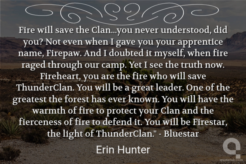 Fire will save the Clan...you never understood, did you? Not even when I gave you your apprentice name, Firepaw. And I doubted it myself, when fire raged through our camp. Yet I see the truth now. Fireheart, you are the fire who will save ThunderClan. You will be a great leader. One of the greatest the forest has ever known. You will have the warmth of fire to protect your Clan and the fierceness of fire to defend it. You will be Firestar, the light of ThunderClan." - Bluestar
