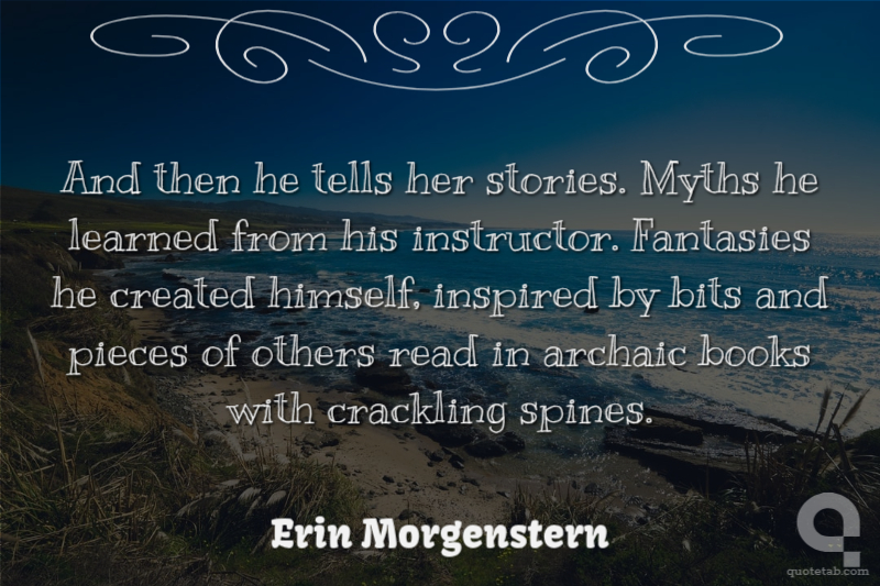And then he tells her stories. Myths he learned from his instructor. Fantasies he created himself, inspired by bits and pieces of others read in archaic books with crackling spines.