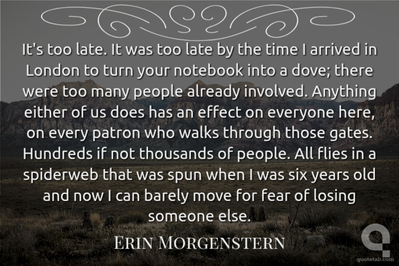 It's too late. It was too late by the time I arrived in London to turn your notebook into a dove; there were too many people already involved. Anything either of us does has an effect on everyone here, on every patron who walks through those gates. Hundreds if not thousands of people. All flies in a spiderweb that was spun when I was six years old and now I can barely move for fear of losing someone else.