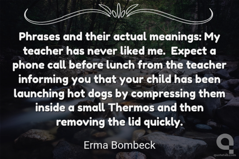 Phrases and their actual meanings: My teacher has never liked me. Expect a phone call before lunch from the teacher informing you that your child has been launching hot dogs by compressing them inside a small Thermos and then removing the lid quickly.