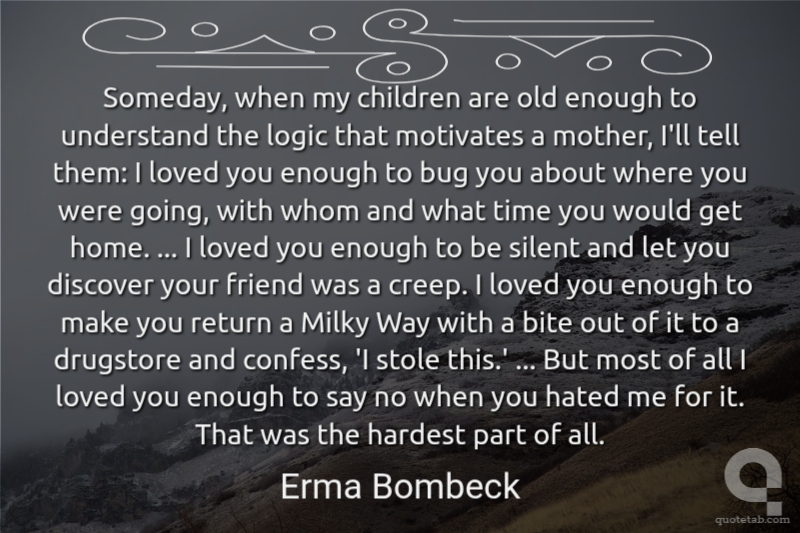 Someday, when my children are old enough to understand the logic that motivates a mother, I'll tell them: I loved you enough to bug you about where you were going, with whom and what time you would get home. ... I loved you enough to be silent and let you discover your friend was a creep. I loved you enough to make you return a Milky Way with a bite out of it to a drugstore and confess, 'I stole this.' ... But most of all I loved you enough to say no when you hated me for it. That was the hardest part of all.
