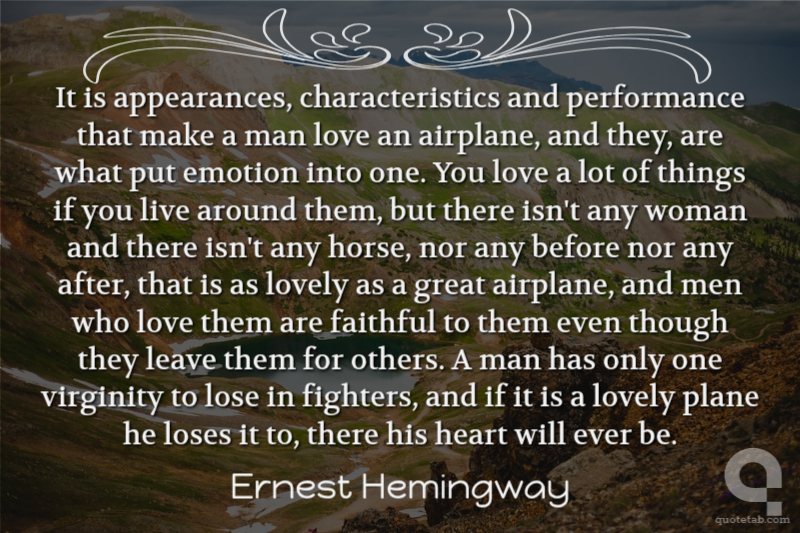It is appearances, characteristics and performance that make a man love an airplane, and they, are what put emotion into one. You love a lot of things if you live around them, but there isn't any woman and there isn't any horse, nor any before nor any after, that is as lovely as a great airplane, and men who love them are faithful to them even though they leave them for others. A man has only one virginity to lose in fighters, and if it is a lovely plane he loses it to, there his heart will ever be.