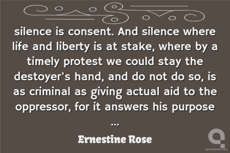 silence is consent. And silence where life and liberty is at stake, where by a timely protest we could stay the destoyer's hand, and do not do so, is as criminal as giving actual aid to the oppressor, for it answers his purpose ...