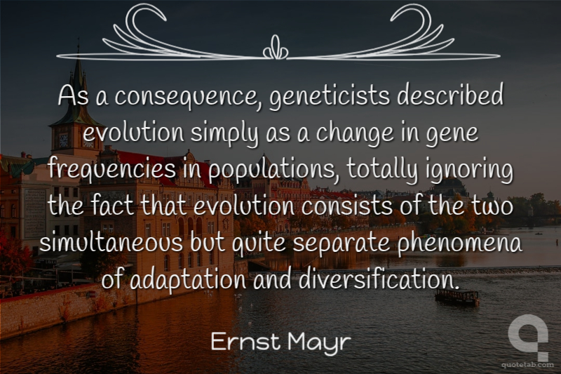 As a consequence, geneticists described evolution simply as a change in gene frequencies in populations, totally ignoring the fact that evolution consists of the two simultaneous but quite separate phenomena of adaptation and diversification.