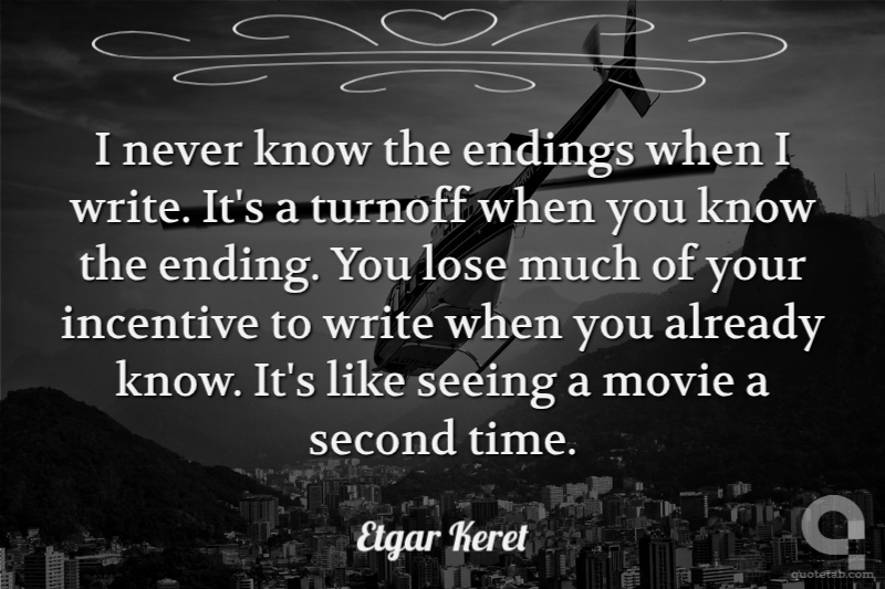 I never know the endings when I write. It's a turnoff when you know the ending. You lose much of your incentive to write when you already know. It's like seeing a movie a second time.