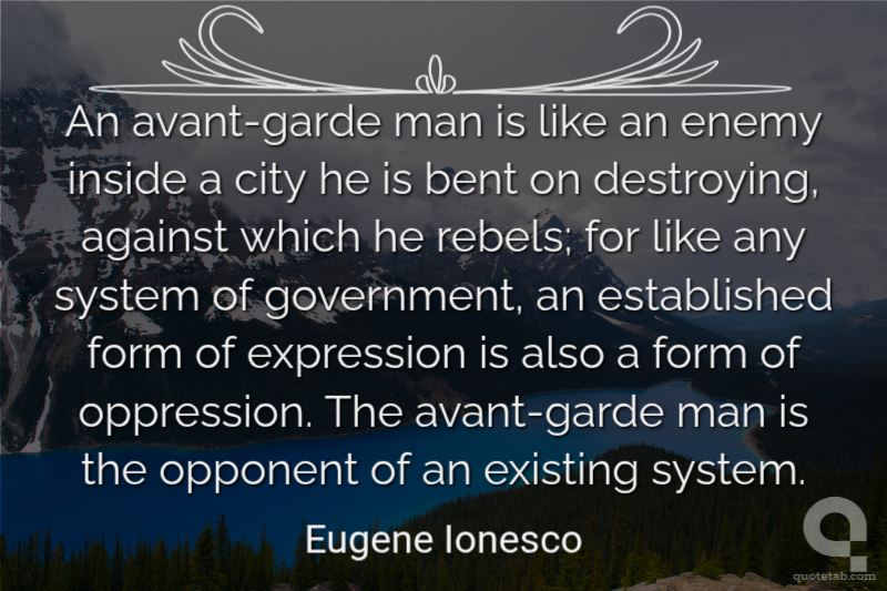 An avant-garde man is like an enemy inside a city he is bent on destroying, against which he rebels; for like any system of government, an established form of expression is also a form of oppression. The avant-garde man is the opponent of an existing system.