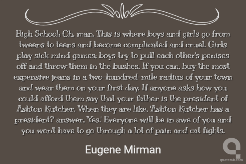 High School: Oh, man. This is where boys and girls go from tweens to teens and become complicated and cruel. Girls play sick mind games; boys try to pull each other's penises off and throw them in the bushes. If you can, buy the most expensive jeans in a two-hundred-mile radius of your town and wear them on your first day. If anyone asks how you could afford them say that your father is the president of Ashton Kutcher. When they are like, 'Ashton Kutcher has a president?' answer, 'Yes.' Everyone will be in awe of you and you won't have to go through a lot of pain and cat fights.
