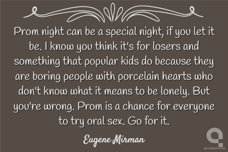 Prom night can be a special night, if you let it be. I know you think it's for losers and something that popular kids do because they are boring people with porcelain hearts who don't know what it means to be lonely. But you're wrong. Prom is a chance for everyone to try oral sex. Go for it.