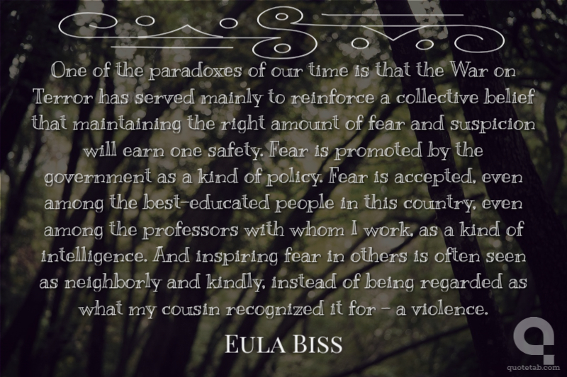 One of the paradoxes of our time is that the War on Terror has served mainly to reinforce a collective belief that maintaining the right amount of fear and suspicion will earn one safety. Fear is promoted by the government as a kind of policy. Fear is accepted, even among the best-educated people in this country, even among the professors with whom I work, as a kind of intelligence. And inspiring fear in others is often seen as neighborly and kindly, instead of being regarded as what my cousin recognized it for - a violence.