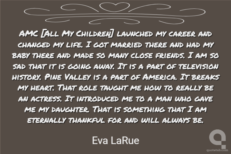 AMC [All My Children] launched my career and changed my life. I got married there and had my baby there and made so many close friends. I am so sad that it is going away. It is a part of television history. Pine Valley is a part of America. It breaks my heart. That role taught me how to really be an actress. It introduced me to a man who gave me my daughter. That is something that I am eternally thankful for and will always be.