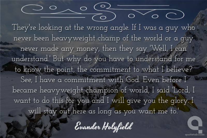 They're looking at the wrong angle. If I was a guy who never been heavyweight champ of the world or a guy never made any money, then they say 'Well, I can understand.' But why do you have to understand for me to know the point, the commitment to what I believe? See, I have a commitment with God. Even before I became heavyweight champion of world, I said 'Lord, I want to do this for you and I will give you the glory. I will stay out here as long as you want me to.'