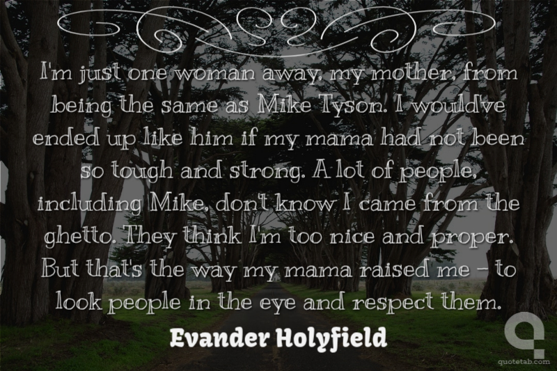 I'm just one woman away, my mother, from being the same as Mike Tyson. I would've ended up like him if my mama had not been so tough and strong. A lot of people, including Mike, don't know I came from the ghetto. They think I'm too nice and proper. But that's the way my mama raised me - to look people in the eye and respect them.