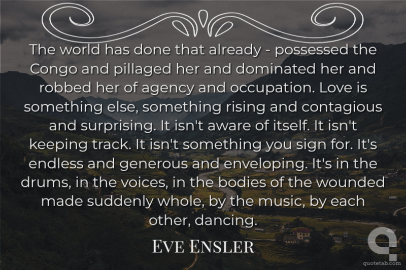 The world has done that already - possessed the Congo and pillaged her and dominated her and robbed her of agency and occupation. Love is something else, something rising and contagious and surprising. It isn't aware of itself. It isn't keeping track. It isn't something you sign for. It's endless and generous and enveloping. It's in the drums, in the voices, in the bodies of the wounded made suddenly whole, by the music, by each other, dancing.