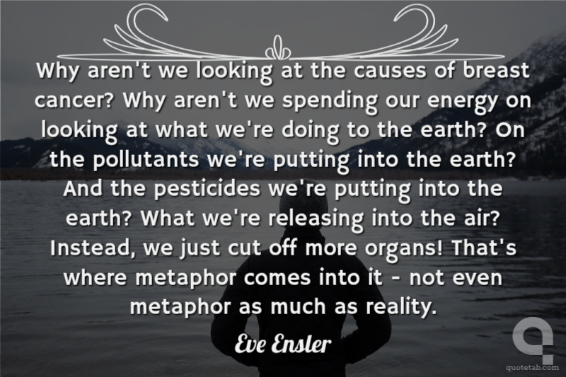 Why aren't we looking at the causes of breast cancer? Why aren't we spending our energy on looking at what we're doing to the earth? On the pollutants we're putting into the earth? And the pesticides we're putting into the earth? What we're releasing into the air? Instead, we just cut off more organs! That's where metaphor comes into it - not even metaphor as much as reality.