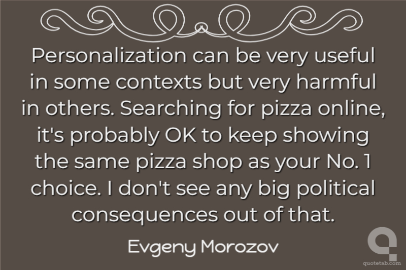 Personalization can be very useful in some contexts but very harmful in others. Searching for pizza online, it's probably OK to keep showing the same pizza shop as your No. 1 choice. I don't see any big political consequences out of that.