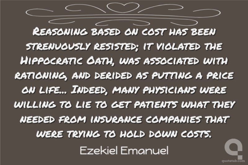 Reasoning based on cost has been strenuously resisted; it violated the Hippocratic Oath, was associated with rationing, and derided as putting a price on life... Indeed, many physicians were willing to lie to get patients what they needed from insurance companies that were trying to hold down costs.