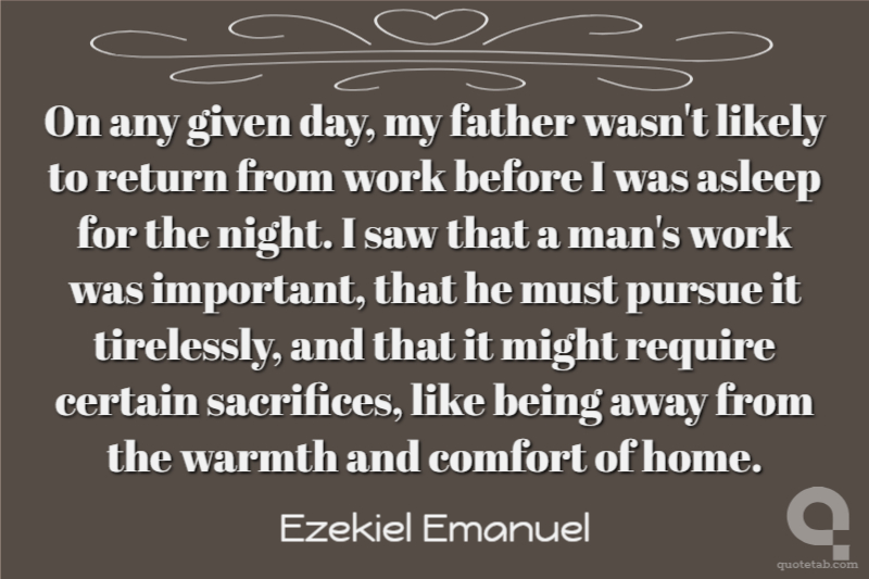 On any given day, my father wasn't likely to return from work before I was asleep for the night. I saw that a man's work was important, that he must pursue it tirelessly, and that it might require certain sacrifices, like being away from the warmth and comfort of home.