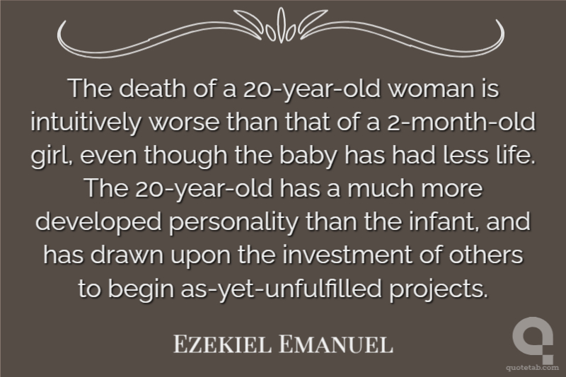 The death of a 20-year-old woman is intuitively worse than that of a 2-month-old girl, even though the baby has had less life. The 20-year-old has a much more developed personality than the infant, and has drawn upon the investment of others to begin as-yet-unfulfilled projects.